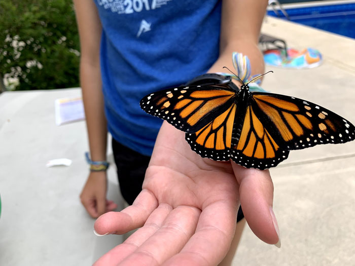 We also tagged the butterflies we released. We got the tags from the science teacher, and the monarch eggs from our backyard!