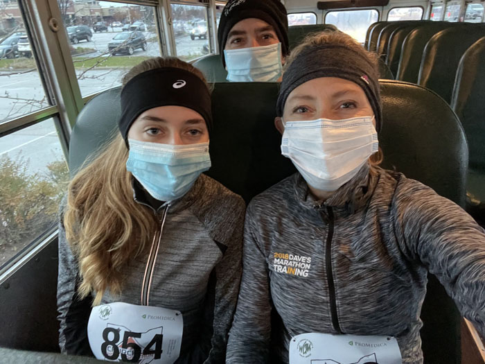 Since this is a point to point race, we needed to ride a bus to get to the start. Luckily this race is super close to our house so we got on the bus at 7:45am. That’s not even early when it comes to races! Per race rules, we wore masks on the bus.