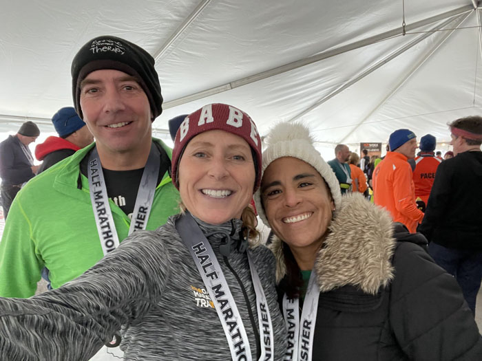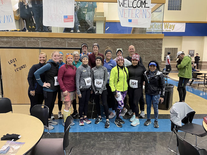 Even though this race is known for cold and sometimes windy days, it does have the use of a high school as the staging area before the race.  A pep band is playing and waking up the crowds of runners, we get to talk to friends before the race, and the restrooms are nice and clean!  Here’s our local chapter of She Runs This Town.  A great group of friends that I’ve had the pleasure of knowing and running with for years now.  I didn’t realize until after I posted this picture on Facebook that a guy was in our picture.  LOL!  It was someone’s husband.