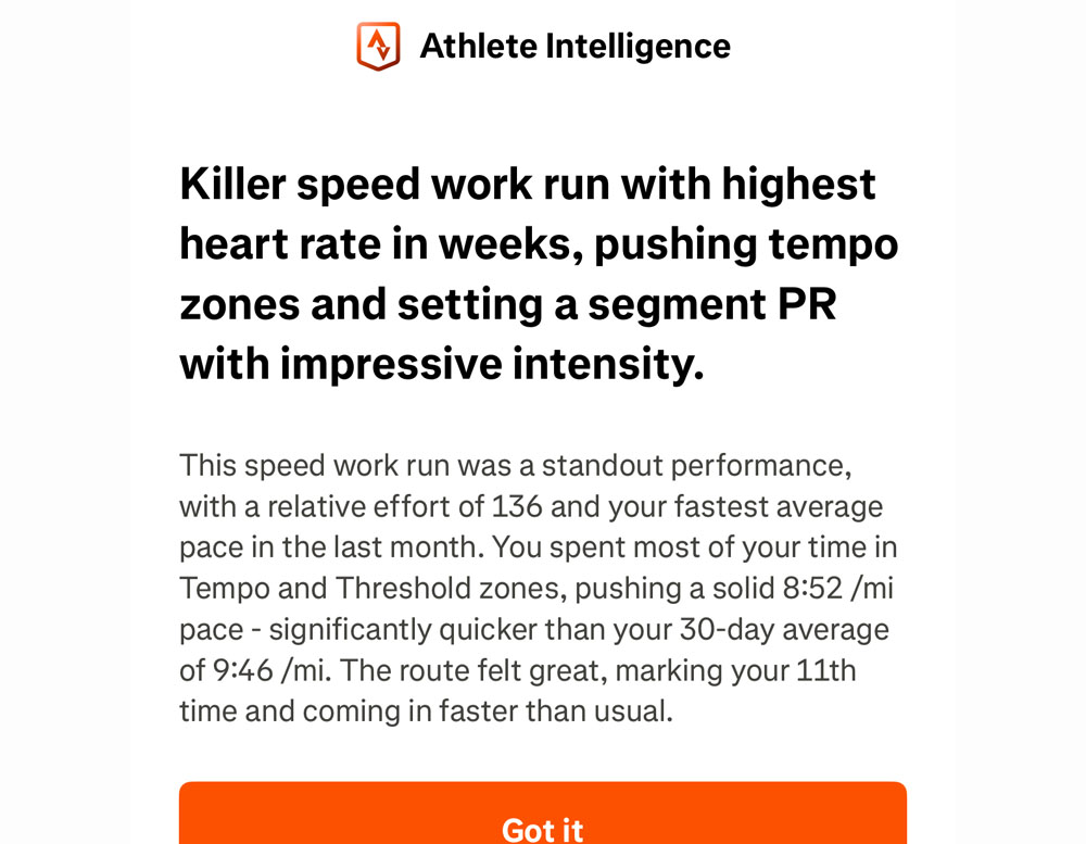 It always feels great when I see an 8:xx. It was a huge confidence boost! Strava was quite complimentary – why thank you!