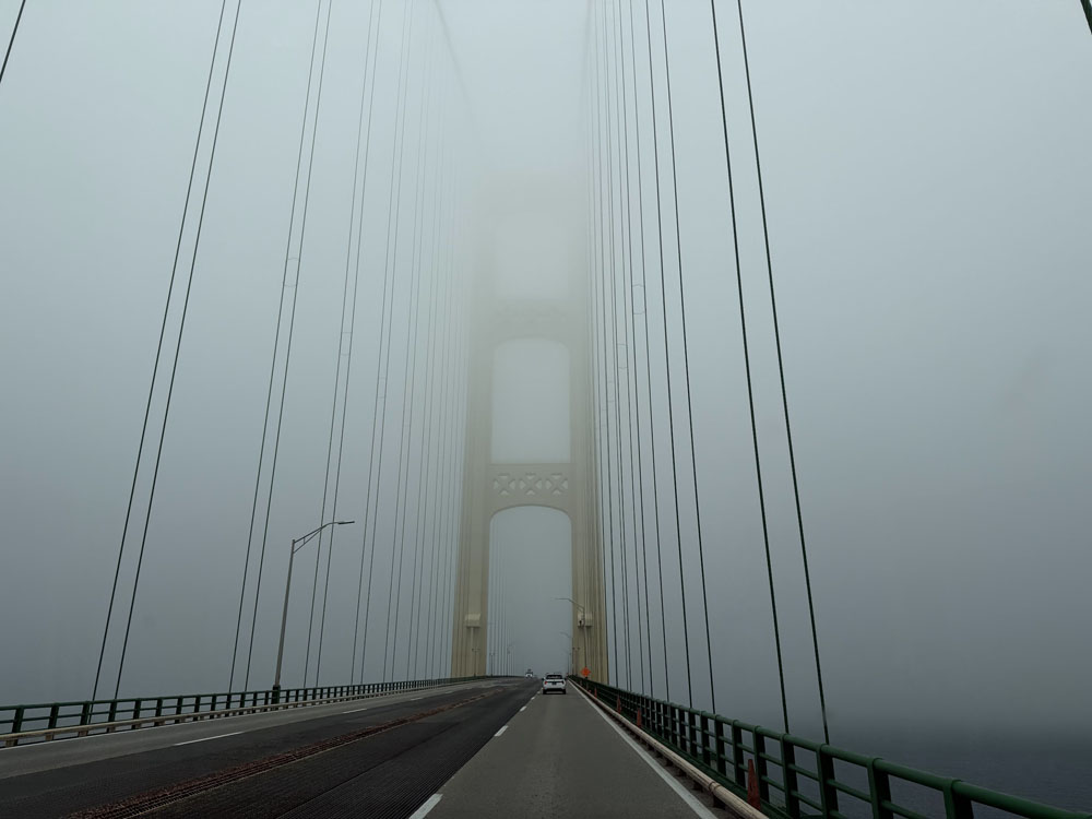 Thurs – Rest day! Today is a travel day. We are camping! We packed up the camper and headed up North. For the first time ever, both cats joined us. We got some meds to make them calm and they slept for most of the 9 hour drive. Unfortunately it was foggy when we crossed the Mackinac Bridge.