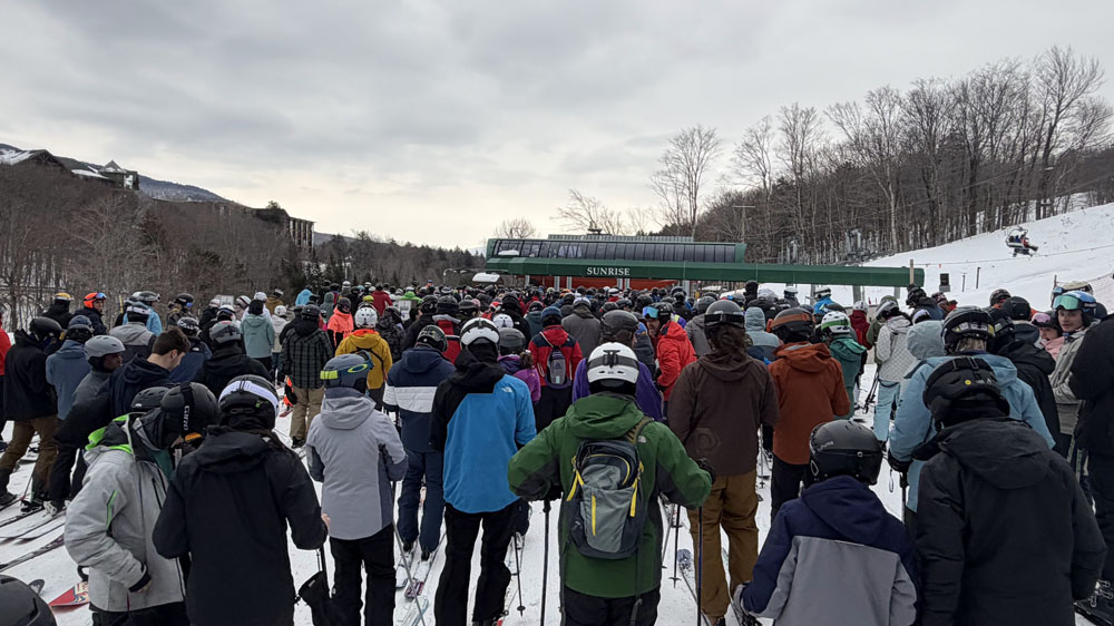 Sat – Ski day at Stowe! It’s busy here because of spring break. The day started out a bit rough with long waits in lift lines and it even started to rain a bit.