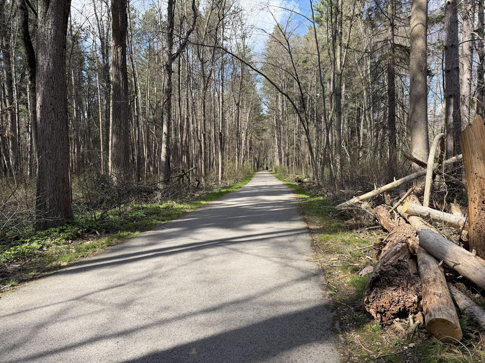 After running errands and doing my tasks I went out for a bike ride. 75 degrees! It was a nice ride and we turned on the air conditioning for the first time at the house. Oh boy. This part of the trail is my favorite. You can smell the pine trees!